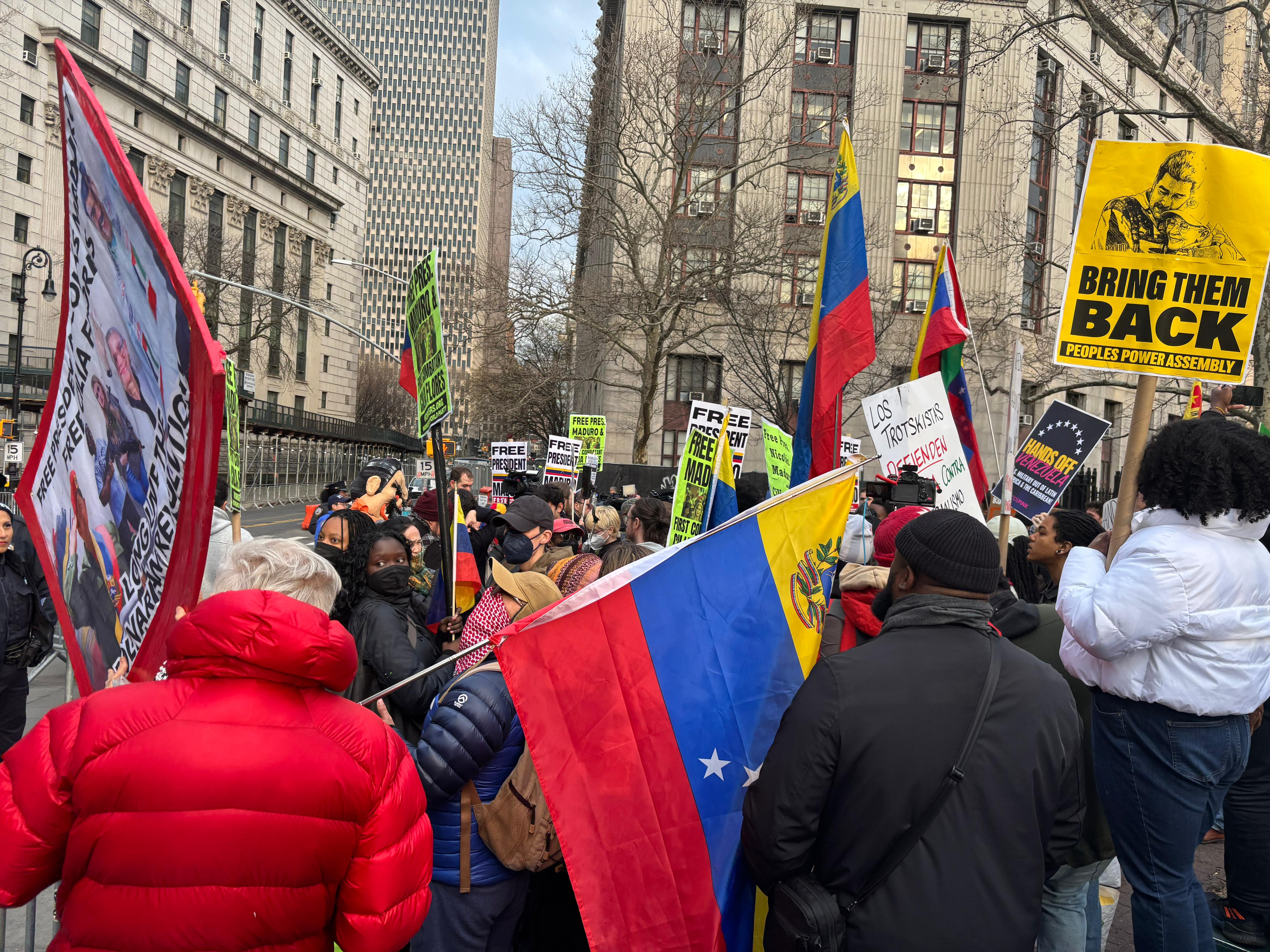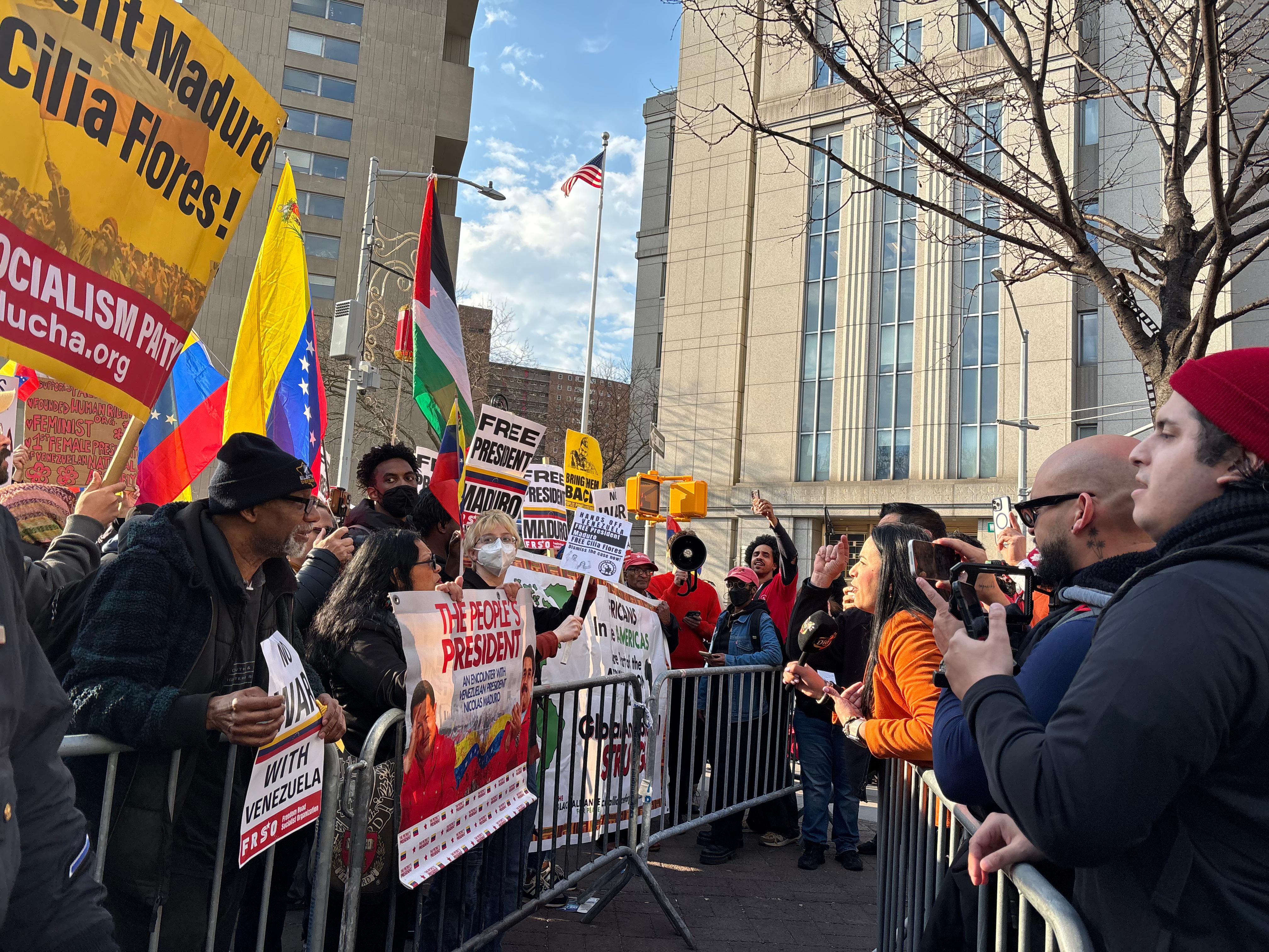Grupos de manifestantes a favor y en contra del juicio de Nicolás Maduro y Cilia Flores se han congregado en las inmediaciones de la Corte Federal del Distrito Sur de Nueva York (SDNY), ubicada en Manhattan, donde se celebrará la segunda audiencia de este caso.