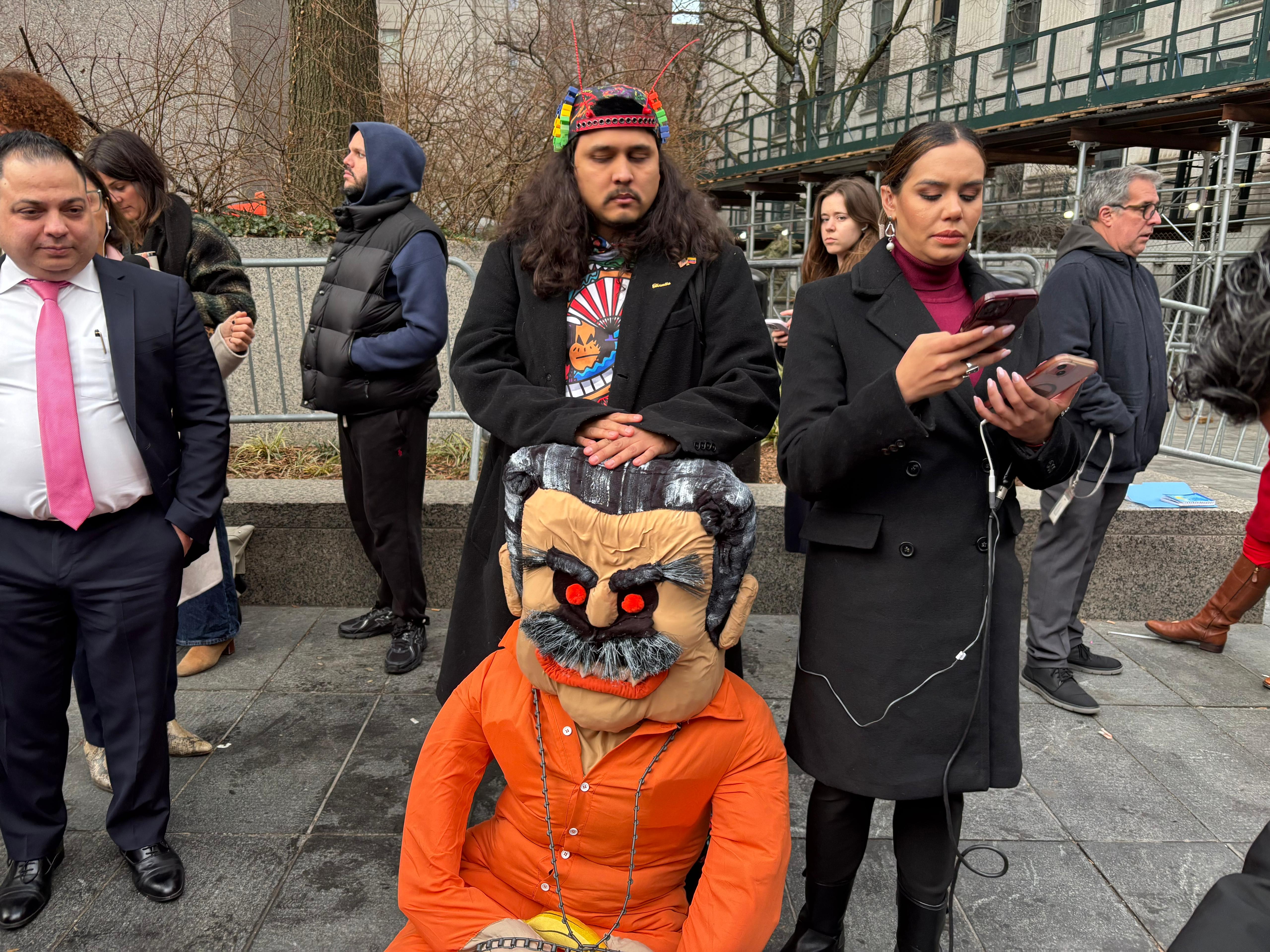 El caricaturista venezolano Jorge Torrealba llevó a la zona del tribunal un muñeco que confeccionó y que representa a Nicolás Maduro. Marta Campabadal Graus